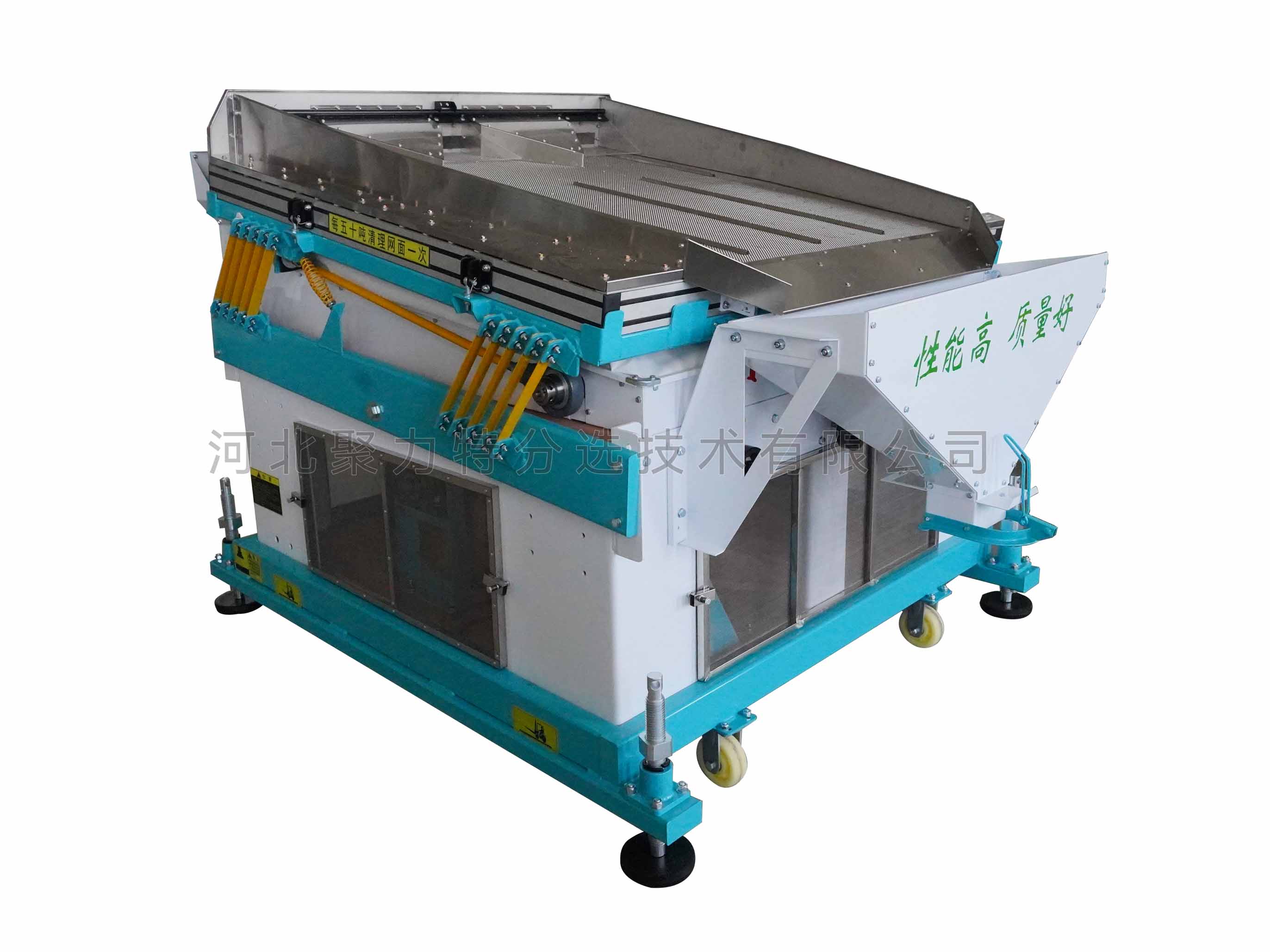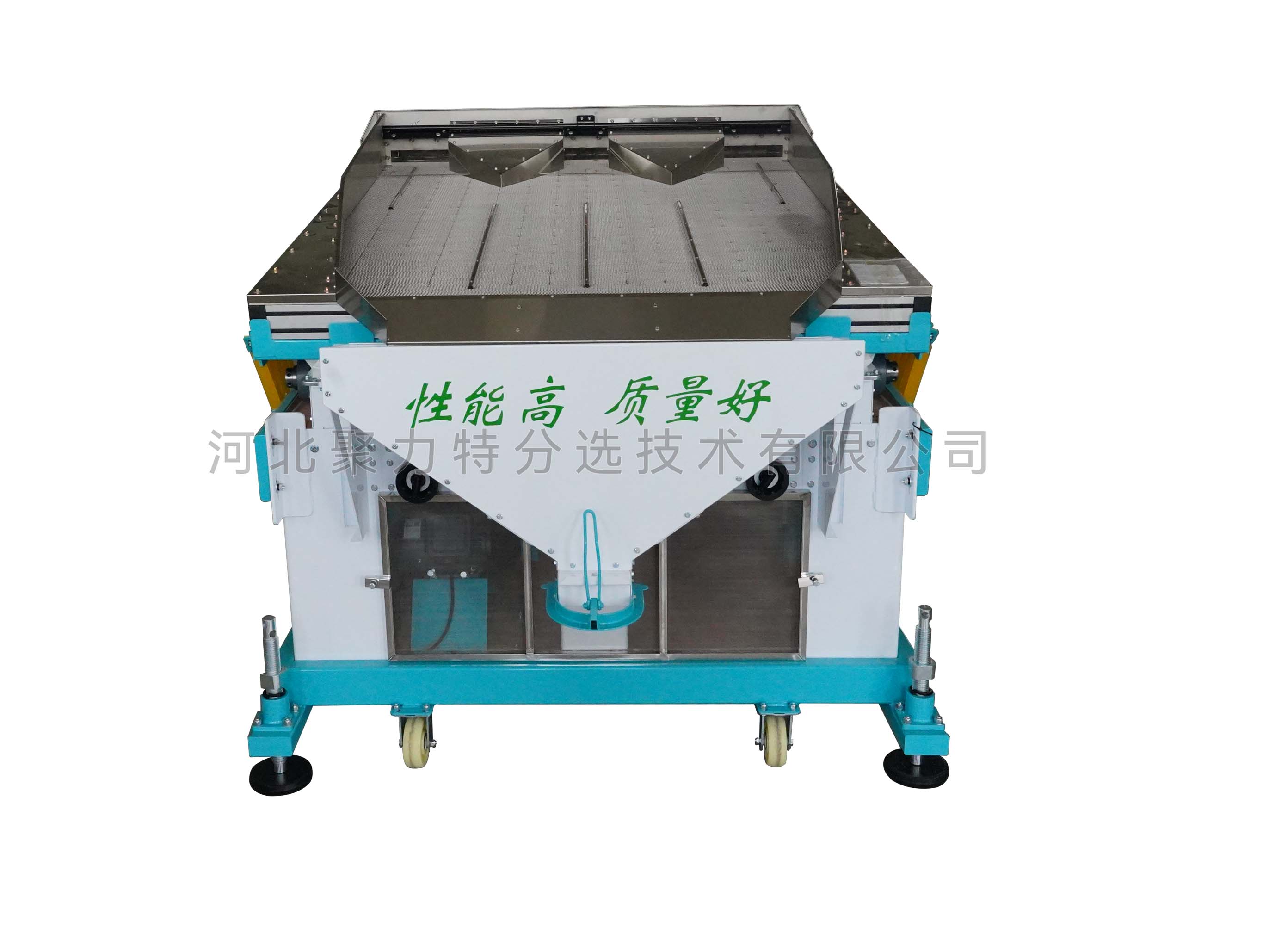 適用于單一目的物料的選別,能把物料中的并肩石(與物料粒度大小相似的砂石)等較重的雜質(zhì)有效去除。在糧食加工的工藝流程中應(yīng)安裝在篩選流程的后段工序,未經(jīng)去除大、小、輕雜質(zhì)的原料,不應(yīng)直接進入該機,以避免影響去石效果。