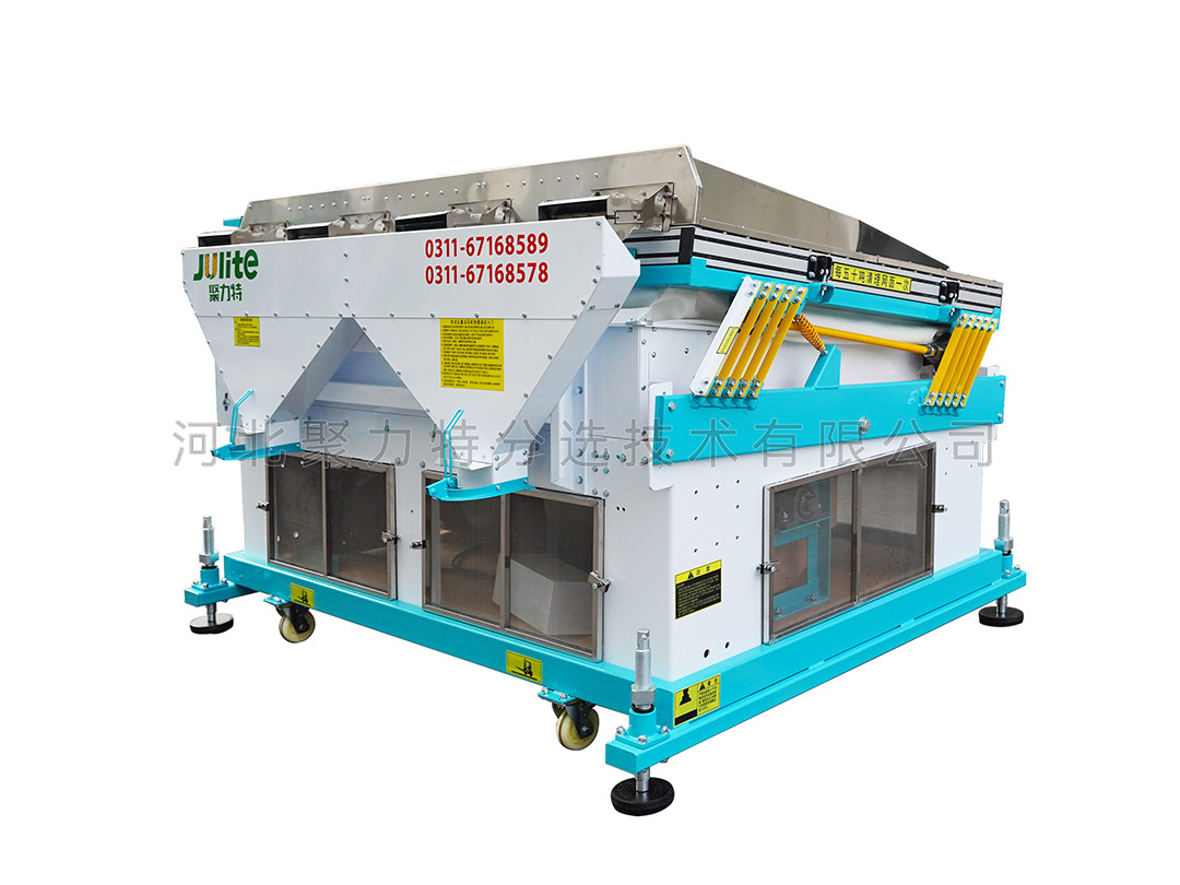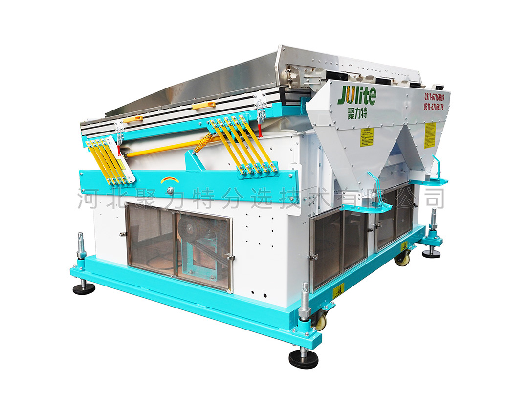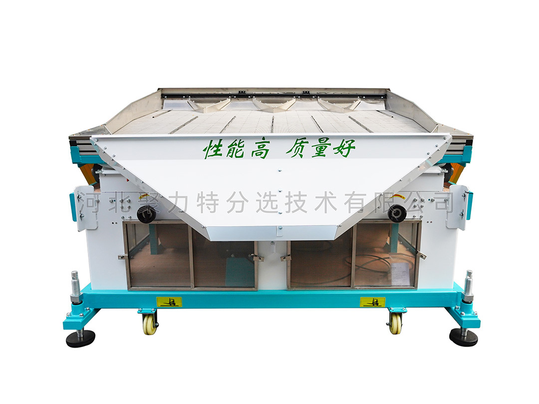 適用于單一目的物料的選別,能把物料中的并肩石(與物料粒度大小相似的砂石)等較重的雜質(zhì)有效去除。在糧食加工的工藝流程中應(yīng)安裝在篩選流程的后段工序,未經(jīng)去除大、小、輕雜質(zhì)的原料,不應(yīng)直接進(jìn)入該機(jī),以避免影響去石效果。